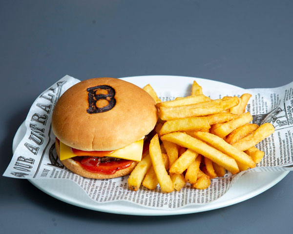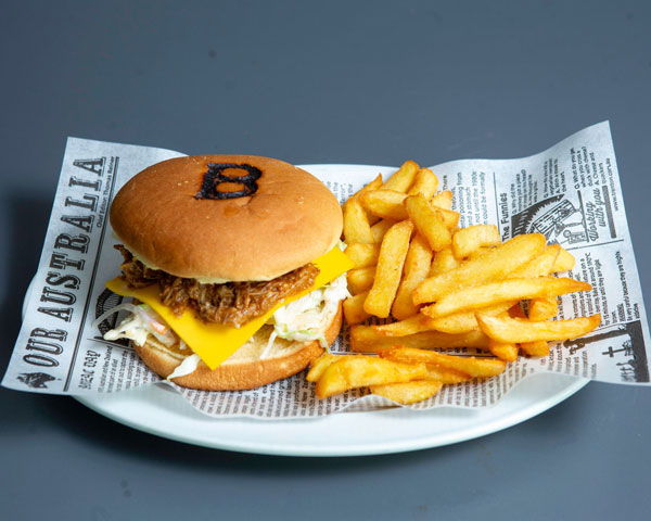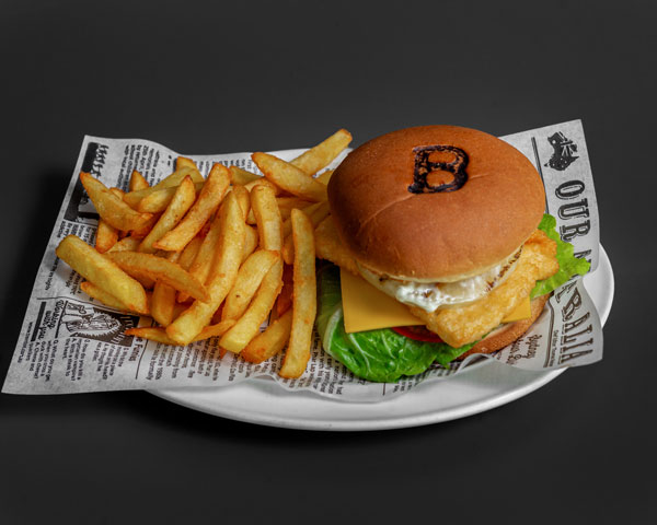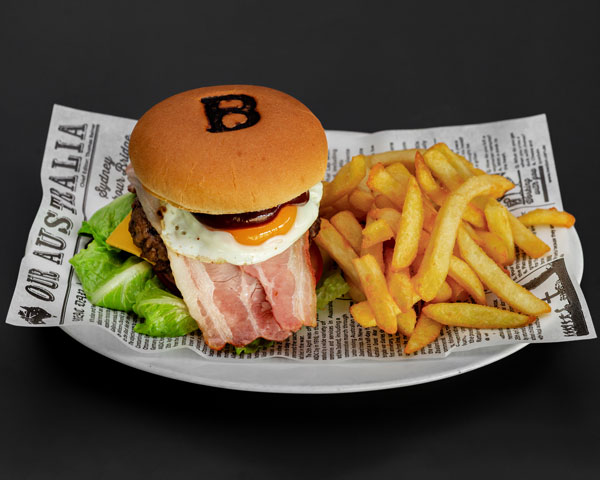 House-made beef patty with lettuce, tomato, cheese, bacon, egg & onion drizzled in aioli & BBQ sauce on a toasted bun. Served with chips.