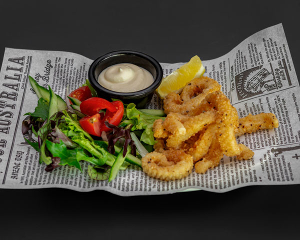 350g of fried calamari pieces dusted in Moroccan spice. Served with chips, salad, a lemon wedge & your choice of sauce.