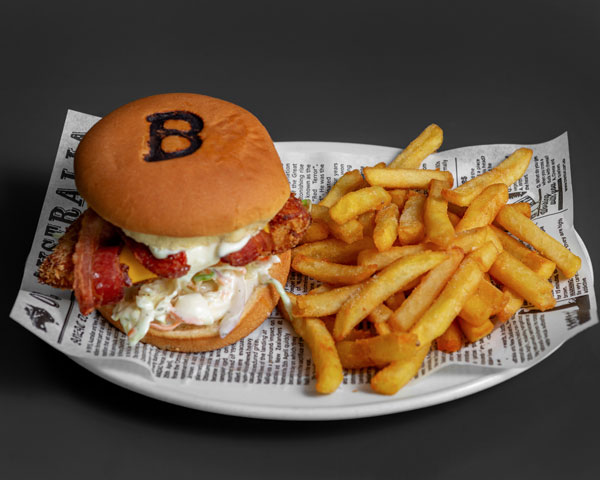 Crumbed chicken breast with house-made coleslaw, cheese & bacon drizzled in aioli on a toasted bun. Served with chips.
