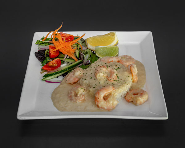 Juicy garlic prawns with creamy garlic sauce on a bed of steamed rice with salad & a lemon wedge