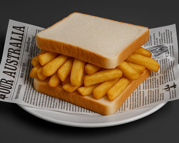 Hot chips drizzled in tomato sauce between two slices of fresh bread.
