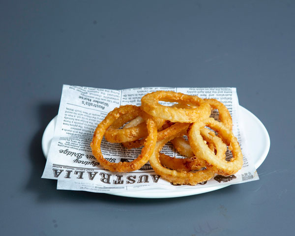 Bowl of hot crispy onion rings served with your choice of dipping sauce.