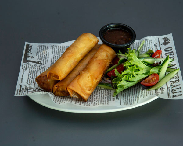 Four house-made crispy pork spring rolls with sweet chili dipping sauce.