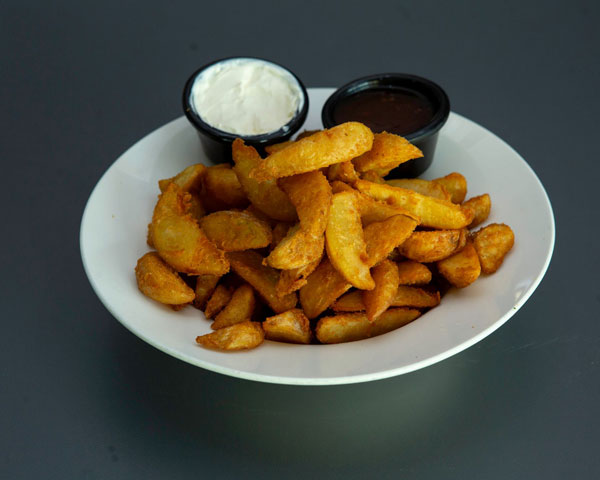 Bowl of potato wedges served with sour cream & sweet chili sauce.